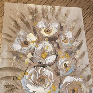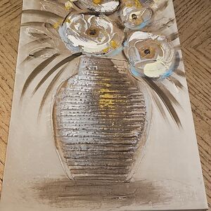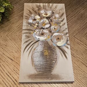 Beautiful floral textured canvas art with a vase. Features shades of gray, white, and gold.