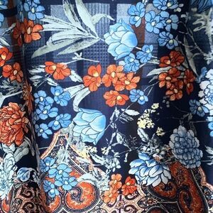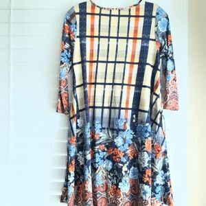 Rust Floral 3/4 Sleeved Tunic, Brand - 42POPS, Size S, 35” from shoulder to hem, 96% Polyester and 4% Spandex, Machine Washable, Side pockets.