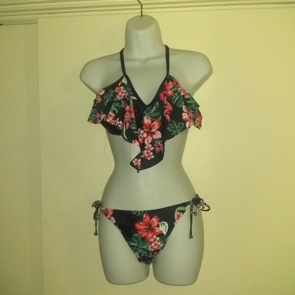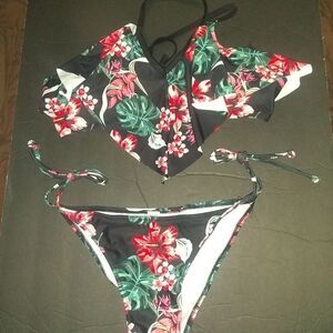The halter top has a fluttery ruffle. With matching string bikini bottom. Black with red flowers and green leaves print
