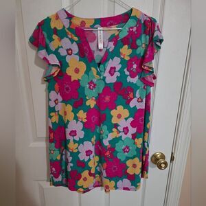 Bright floral V-neck blouse with ruffled sleeves. Tags off for try on 94% Polyester 6% Rayon Size Large PTP 21 - 22 in