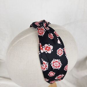 Black with light and dark pink floral pattern, wide band narrows at the top with a twist and pleats in the material. NWOT, never worn.