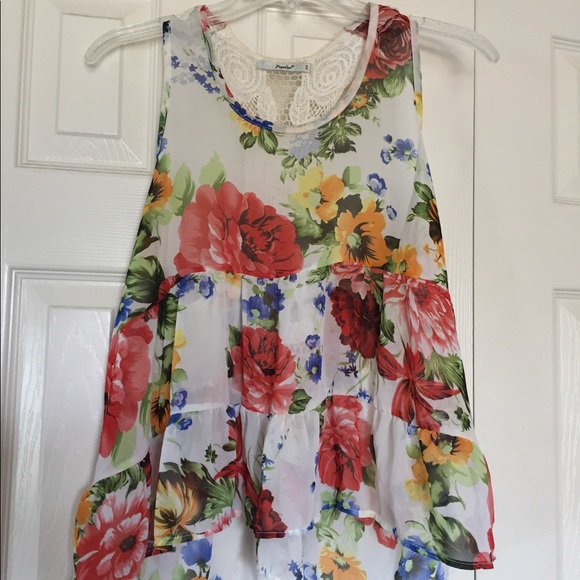 Adorable floral tank top with lace strap in back. Shear tank. Women's size medium, very cute and in great condition. Great for summer/spring warm weather