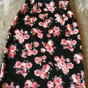 Floral Pencil Skirt Black with pink roses. Features a stretchy knit material that is super comfy for the office and happy hour! Measures 25" in length with a 13" elastic waist. Like new condition!