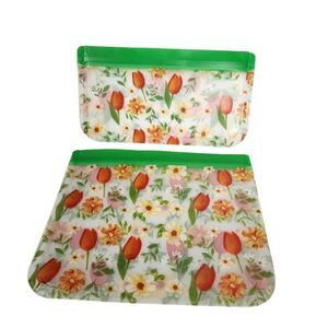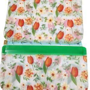 Floral tulip and daisy print clear silicone resealable bags. Set Of 2 sizes. Great for beach, travel or events. Compliant with clear bag restrictions at events. Water proof, leak proof. Works great to keep wet items after swimming.