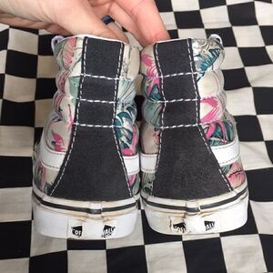 Super cute floral vans with grey suede like material on the toe and heel. Used but lots of life left in them! Some of the fabric is ripped on the shoe and separating from the plastic; but not noticeable when being worn. Women’s size 7!