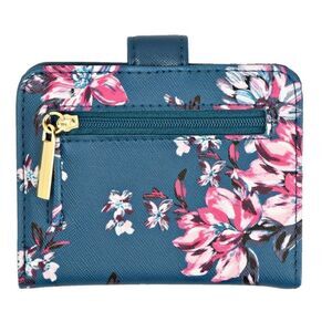 This wallet is perfectly sized to fit into any handbag. The interior of the wallet has a slot for currency and receipts, as well as six credit card slots. There is a two sided flip window that is great for your ID and photos. The exterior zipper compartment is ideal for coins, and the wallet is secured with a snap tab closure.