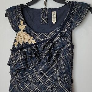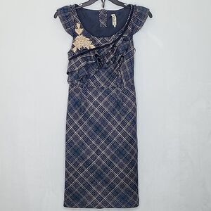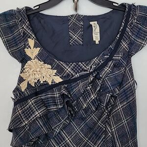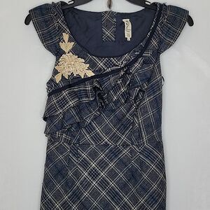 Floreat Anthropologie Plaid Ruffle Floral Dress Cap Sleeve Applique Size 2