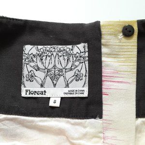 Very good pre-owned condition. Floreat Anthropologie Scythed Lawns Ruffled Skirt. Size 8. 100% cotton. Dry clean. Waist and ruffle are black. Skirt is cream with pink and yellow-green detail. Ruffle is stitched down so it will remain crisp. Fully lined. Zipper, hook, and button closure. Back slit still has basting stitch to remove before wearing.