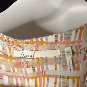 Chic top with abstract patterns. Features orange, pink, and cream hues. Stylish and versatile.
