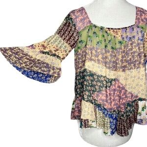 Features-Flowy, patchwork print, 3/4 bell sleeves. Small gold bead detail on hem and sleeves. Lined. Pullover style.