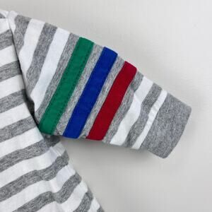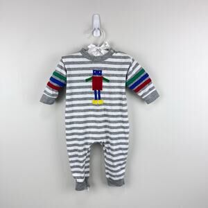 Florence Eiseman Stripe Knit Robot Longall Romper. Baby boy size 9 months. Cozy long sleeve one piece coverall outfit. Gray and white stripes with applique robot on the chest and colorful stripes on the sleeves. Snaps on the shoulder and inseam zipper for easy on/off. Great condition with no flaws noted!