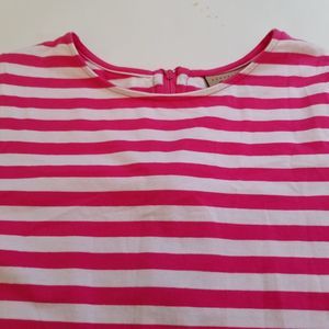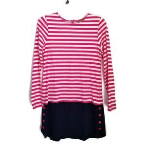 Long sleeve pink and white striped bodice, navy blue bottom accented with pink buttons, exposed back zipper.