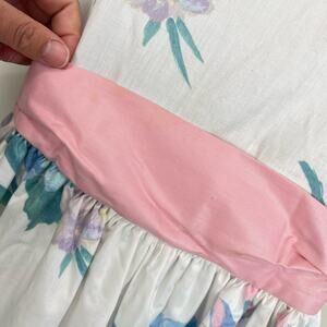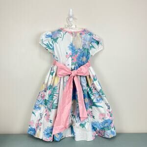 Florence Eiseman Vintage Floral Dress. USA made. Tag removed, however see last for tag from same dress in smaller size. (See photo for STH measurement; this looks about a 6, though size is flexible depending on your desired length. For reference, the 4T measured approx. 24.5" STH.) This short sleeve party dress is perfect for Easter or any other special occasion this spring or summer! Water color flower print with big pink bow in the back. Has a few scattered marks (see photos; all untreated), but they blend into the busy print and this looks gorgeous!