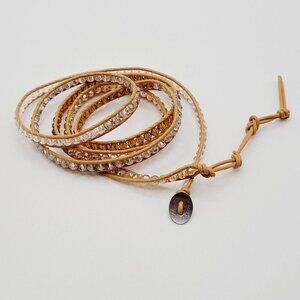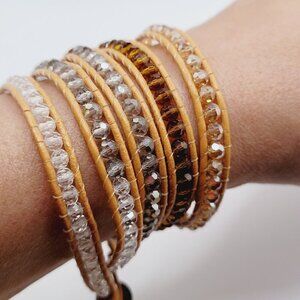 Florence Scovel 39" 5x Tan Leather Wrap Bracelet Faceted Beads Exc Cond Bohemian