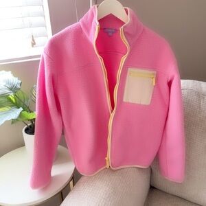 Cozy pink fleece jacket featuring cream accents and a zip pocket. Perfect for casual wear.