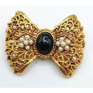 Vintage Antique Gold Tone with Pearls & Jet Black Stone Brooch