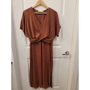 Texturized V-neck midi dress with structured short sleeves and a twist at the bodice. Modest dress in pull on style and slits at legs. Fully Lined.
