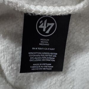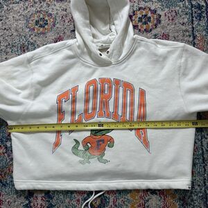 The product is a 47 Women's Harper Adjustable Cropped Pullover Hoodie in cream, featuring the Florida Gators team logo. This stylish sweatshirt is designed for female fans of the football team, with a comfortable fit in size medium. The ivory color adds a classic touch to the garment, making it a perfect choice for showing support for the Florida Gators in a trendy and casual way.