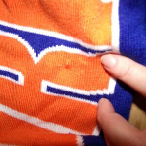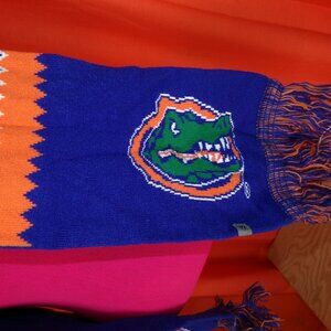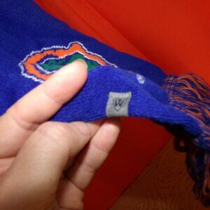 Knit scarf with Florida across the back & the Gator logo on each end. Orange & blue fringe on the ends. Solid blue on the back.
