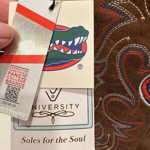 New with tags Vaccari cowboy boots featuring official University of Florida Gators embroidery. Handmade in Mexico with genuine leather, these boots showcase bold orange and blue team logos with detailed western stitching. With a 14.75" shaft and 1.75" heel, they deliver both authentic cowboy style and college football spirit. Perfect for fans, alumni, and collectors looking for a rare, sold-out pair to wear on game day or display.