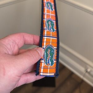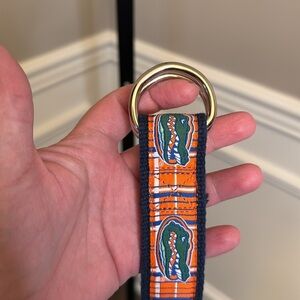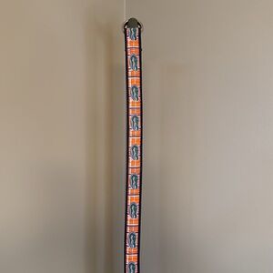 Never worn but has some minor wear to the bottom from storage. Size large. The colors are navy, orange, green, and white. Features D ring belt loops that are silver. This belt feels very durable with a jute type fabric that stands up to wear. This is a quality belt.