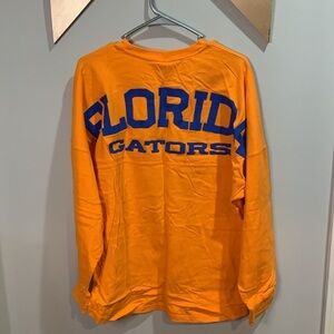 New with tags. Size small. Features thumb holes. Has the Florida gator logo on the front and Florida gators written across the back. Oversized spirit jersey. The colors are blue and orange.