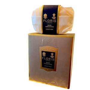 Indulge in the Floris Rose Geranium luxury soap. Elegant packaging with gold accents.