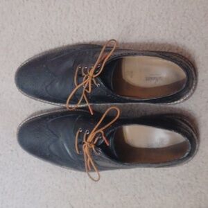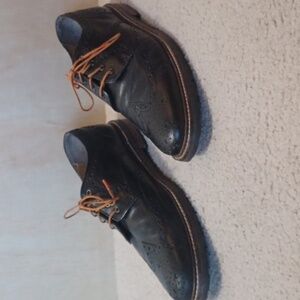 11D Florsheim black leather Oxford shoes. brogue wingtip design. leather upper quarter and lining. rubber sole. rounded toe. excellent pre-owned condition