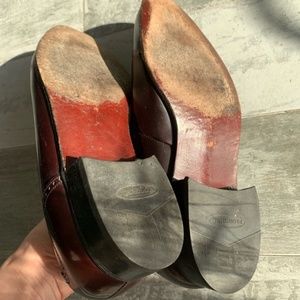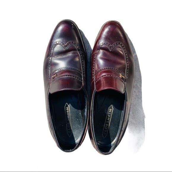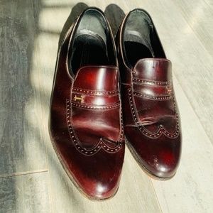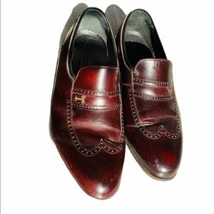 Florsheim shoes Burgundy Bordeaux Red Wood Genuine Leather no laces slip in perforated as cat-eye vintage loafers dress slip-on loafers satin patent rigid holding shape leather Bordeaux leather looks like black in dark, has a cat eye vintage detail cut on toes and upper heels slight block heel.