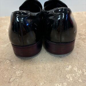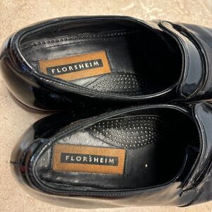 Florsheim men patent leather penny loafers black 38 7.5D block heel shoe show creases on top of toes. Please see all photos. 449705