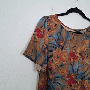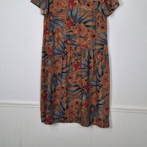 Pre-owned, good condition. No visible holes or stains. Gorgeous floral print in shades of fuchsia, blue and hints of black over a camel background. Babydoll style with innovative asymmetrical cut. Midi length. Round neckline. Short sleeves. Lightweight and airy, perfect for Spring/Summer. Size per tag: L (Large). Size per tag does not guarantee desired fit, please see pictures for measurements.