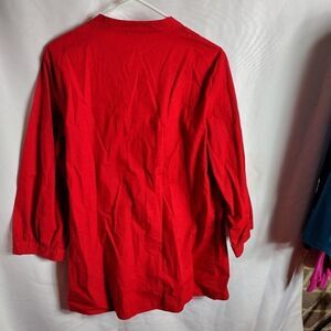 red, button up, loose fitting top with 3/4 Length sleeves. lace embellishments. pit to pit 20" length 31". OO