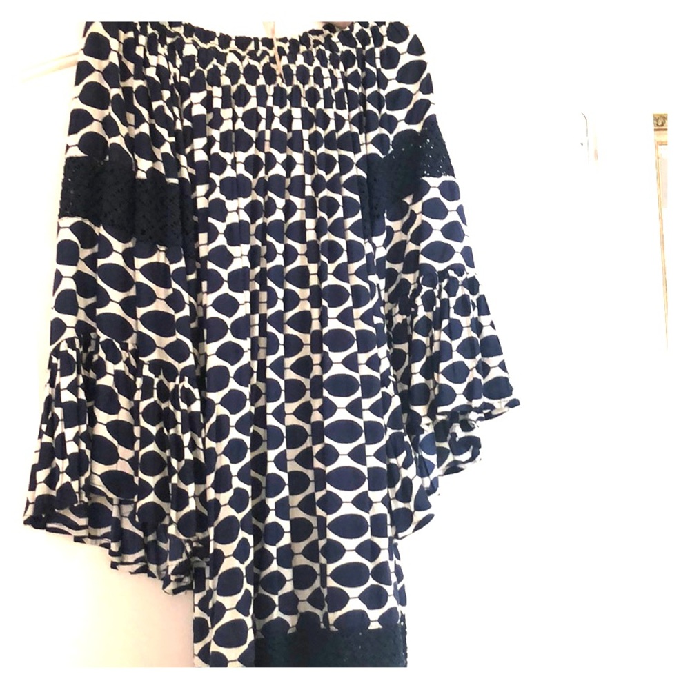 Adorable Navy/White Flounce sleeve top. Bell cut...accented with Navy crochet on sleeves and hemline. Can be worn off shoulder. Looks sharp with white jeans!
