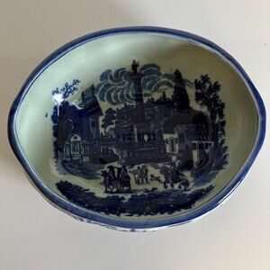 This ceramic bowl showcases intricate blue transferware designs featuring scenic landscapes.
