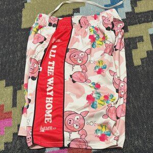 Lacrosse Shorts from Flow Society, Authentic Lacrosse Gear. Performance shorts in a fun novelty print of a very stern and serious pig. 'All the Way Home' printed down the side panel .Loose fitting and allowing for optimal movement to play anywhere!