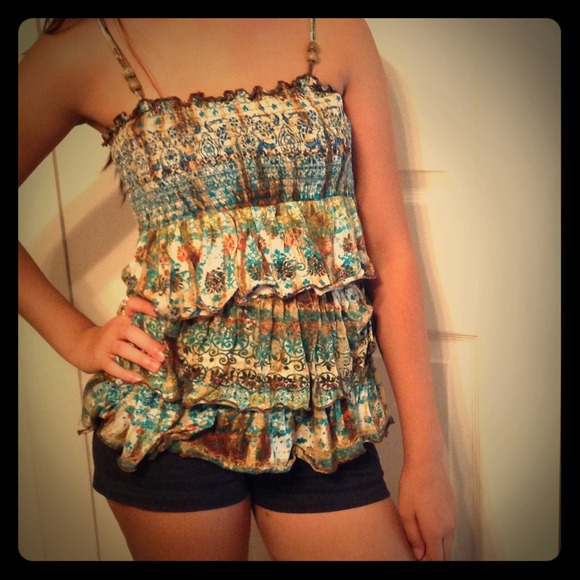It has elastic on the top with florals all over. It looks like a tube top but with straps. Stretchy for those who have more on top. ;)