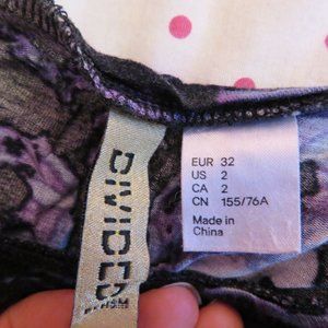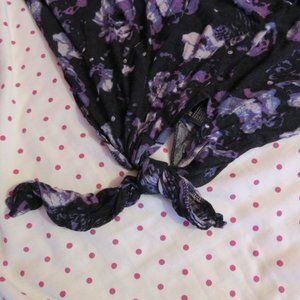 This flowy shirt is black with purple flower pattern throughout. The back is slightly higher than the front, and it is tied in the bottom left corner
