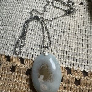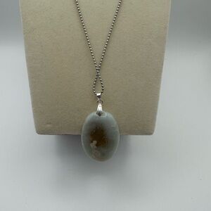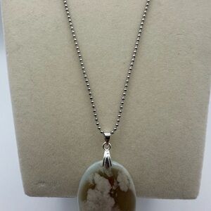 Flower agate round/oval pendant necklace on silver color ball chain (either stainless steel or copper). Chain is approx 18” with 2” extender. Pendant is flatter on one side than the other, but could be worn with either side face up. One side has clearer, beautiful flower patterns and the other side is more milky/cloudy. Both sides have hints of mint green and some traces of red carnelian chalcedony.