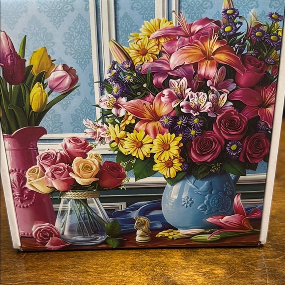 Colorful jigsaw puzzle with a flower bouquet design. Includes vibrant pink, blue, and yellow hues. Ideal for puzzle enthusiasts.