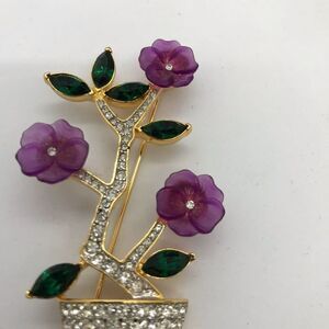 It features purple pastel lucite flowers with white rhinestone centers and green rhinestone leaves. The flower stems are encrusted with white rhinestones and sit upon a gold metal which outlines the stem.