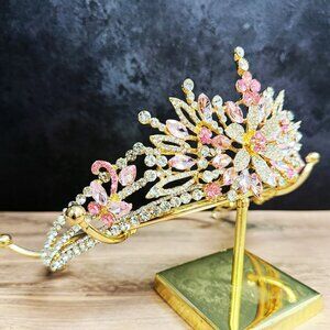 Flower Bridal Crown, Gold Crystal Tiara, Bridal Hair Jewelry, Pink Stone Tiara