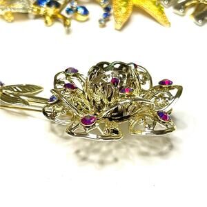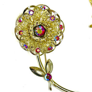 Flower Brooch Signed SARAH Red AB Gold Vtg Vintage Estate Jewelry Pin O06