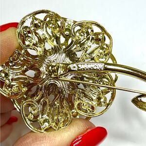 Another lovely brooch, signed Sarah Coventry, adorned with aurora borealis red rhinestones, prong set in gold tone metal. Please see photos for close ups, condition and measurements. We accept all reasonable offers.
