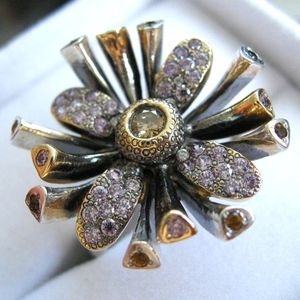 Stunning Flower Burst 14K Yellow Gold Sterling Silver Diamond Amethysts Cocktail Ring
