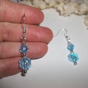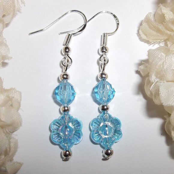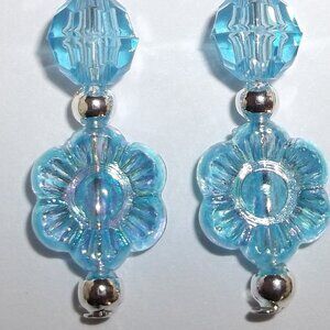 This cute, beaded earring set is brand new NWT and handmade by me - wvluckygirl. Handcrafted with the most eye-catching flowered acrylic beads. The bottom floral beads are a turquoise blue with an aurora borealis AB finish on them. Ab means they flash other colors in the light. These flash purple and blue. They also have silver toned costume jewelry beads. The pair dangle and drop from 925 sterling silver French fishhook ear wires for her pierced ears. Measure 1 7/8 inches tall and 3/8 inch wide. Each single earring weighs 0.8 grams. Very lightweight. Buy them now before someone else does!