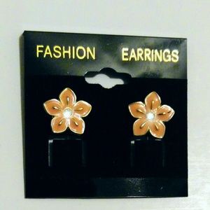 Gold finished flower earrings. Between pink and peach. Crystal center. Never worn. Not original jewelry card.