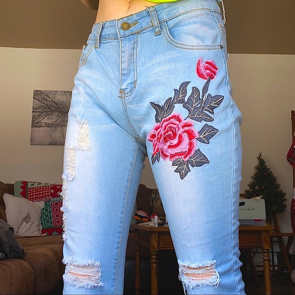 Flower Embroidered Ripped blue jeans