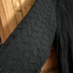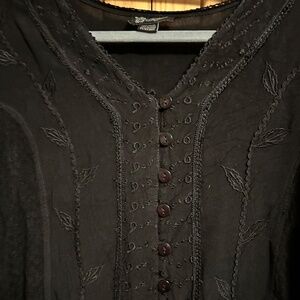 Good condition. Size just says Plus Size. 3/4 sleeves. Button up front with Vee neck. Embroidered flowers and zig zag design down front. Back of blouse ties. Has eyelet hem across bottom and sleeves has small embroidery flowers. All black. 26 pit to pit and 24 inches long in front and 26 in back. 100% Rayon