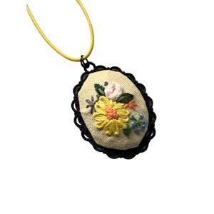 Key Terms: embroidery, embroidered necklace, handmade jewelry, hand stitched jewelry, fiber arts, handsewn jewelry, cameo necklace, flower necklace, embroidered cameo, applique, decorative stitching, applique stitch, needlework, handsewn, needlework, sunflower necklace