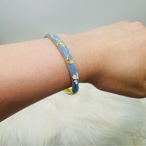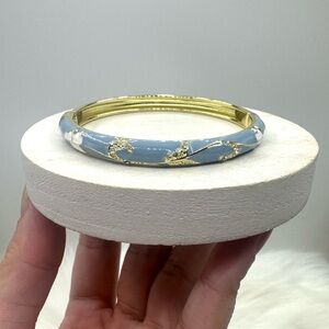 New floral Bangle Bracelet Blue base with floral design Opens in the middle 2.4” diameter 8” length * wrist reference in photo is 6 inches in size